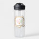 This tumbler has a watercolor image of a crest surrounded by floral branches with green and pink gingham pickleball paddles in the centre. Text says "Dinks and Drinks." Colours used include moss green, blush pink and and tan.