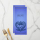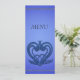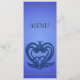 dinner menu card, with dinner menu desserts, meal names. for weddings and all other meetings, ceremonies. designed with blue swirl floral pattern.