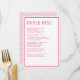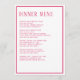 This card coordinates with the wedding invitation suite and is for dinner menu selections. Easily customise the menu choices in our simple template. You can custom colour the border, font and background colour pattern using the simple tools provided. Shown in bright, rich pink. Modern, simple styling with a serif, all cap font design.
