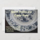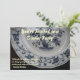 A casual blue and white dinner plate is the background for this dinner party invitation.