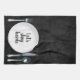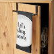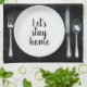 White dinner plate with silverware on black leather design and "let's stay home" text.