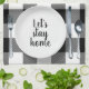 White dinner plate with silverware on farmhouse white and black buffalo plaid pattern and "let's stay home" text.