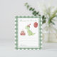 Watercolor kids birthday party. Watercolor Dino in birthday hat, cake with candles, red balloon. Green cage background.