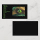 Business card with my image of a green raptor eye with palm tree reflections, peering through palm branches.