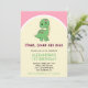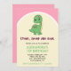 Our sleek and vibrant pink invitation sets the stage for a celebration like no other. At the heart of the design is a cute girly green dinosaur, right beneath the text "stomp chomp roar," all set against a playful pink and yellow background. 🦖💚💕