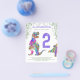 Your little T. rex is turning two so let’s celebrate. This Roaring colourful Tyrannosaurus Rex and cute stegosaurus invite Dinosaur lovers to a prehistoric jungle 2nd birthday party. Personalise this little T. rex turning 2 party invitation by adding the name of the birthday boy or girl, the number of the birthday and the party details and you are all set for a fun packed dinosaur purple themed dino party. All dinosaur species are welcome. Original artwork illustration by artist by Catherine Sweetman