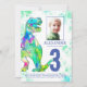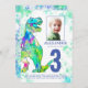 Colourful dinosaur 3rd birthday party invitation with photo template for the boy who is turning three and loves dinosaurs. This Roaring T Rex invites Dino fans to a fun 3rd birthday party. Customise this colourful watercolor splash blue and green third birthday invitation with a photo of the birthday boy or girl, the number of the birthday and the party details and you are all set for a fun packed dinosaur themed dino birthday. All dinosaur species are welcome. Beautiful original artwork by artist Catherine Sweetman