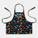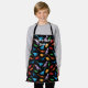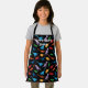 A pattern made out of seven colourful dinosaur silhouettes. There is a Tyrannosaurus Rex, a Pterodactyl, a Triceratops, a Velociraptor, a Stegosaurus, a Brontosaurus, and an Elasmosaurus for the cutest sous-chefs or chefs! Personalise away, or delete the text.