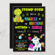 This two theme dinosaur and unicorn birthday invitation for two kids is for combined Dino-mite magic party! It features cute little green dinosaur and little magical unicorn with rainbow hair.