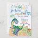 This cute invitation for 2nd second birthday party featuring several roaring dinosaurs, balloons and party banner at the top.