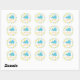 This cute dinosaur sticker has an orange, green, and blue stripes background. In the middle, there's a circle with a blue dinosaur with a party hat on his head. Below the dino, you can easily personalise the text!