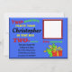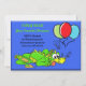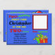 A colourful dinosaur themed second birthday invitation to help the "One osaurus" celebrate that 2nd birthday. Flashes of red, green, yellow, and black with a happy dinosaur and present provide a lovely contrast to the blue background. The rear features a dinosaur parent exhausted after a party. Change the text and add a photo of your precious little one using the templates provided.