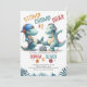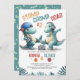 A fun and cute birthday party invitation for two, with a dinosaur theme and the title Stomp Chomp & Roar, featuring a watercolor illustration of two adorable dinosaurs wearing headsets and having a roaring good time dancing. Celebrate your wild little ones with this roaring funny invitation that will set the tone for a wild time.