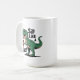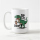 The design features a cute green T-Rex enjoying a hot cup of coffee.