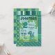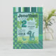 Blue, green pre historic landscape, baby dinosaur boy in egg shell birthday party invitation. Dino party for kids, modern pattern with cute dino cartoon. Customisable birthday boy invitation card.