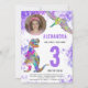 Dinosaur girls 3rd birthday party invitation with photo template. Purple watercolor splash and colourful T-Rex and pterodactyl dino to celebrate your little T-Rex turning three, ideal for the girls who love dinosaurs. Multicolored Tyrannosaurus rex and pterodactyl in vibrant pink purple blue green and teal watercolor bright colours. Easy to use templates to customise with a photo, the number of the birthday and the party details and you are all set for a fun packed Jurassic dinosaur themed dino third birthday party. All dinosaur species are welcome. Original artwork by artist Catherine Sweetman