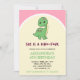 The central design features a cute girly green dinosaur beneath the whimsical text "She is a Dino-Four," all against a pink and yellow background. 🌸💚 The sleek vibrant pink cover adds an extra touch of excitement, making these invitations stand out and setting the tone for a celebration that's as cute as it is wild.