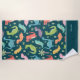 Add a custom Jurassic touch to the ocean trip of your little kid with this monogrammed dinosaur beach towel. Towel has a pattern of colourful dinosaurs on a dark blue background and your little one's first name and monogram in the bottom right corner. There are also palm trees and cacti.