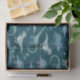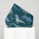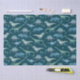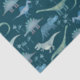 Lots of blue dinosaurs on a dark teal green background. Tyrannosaurus Rex, Spinosaurus, Stegosaurus, Diplodocus and Triceratops.