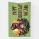 Fun kid's dinosaur themed birthday party banner features T-Rex with sunset and tropical plants on green background.