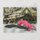 Original artwork of pink cartoon T-Rex dinosaur with long shadow on green vine background. White text: There's always something around the corner!