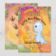 "Join the Roaring Fun! Little Dinosaur "Name" Turns Three!" Embark on a prehistoric adventure as we celebrate the third birthday of our little dino explorer, "Name." The watercolor-style design features the adorable image of a baby dinosaur proudly holding the number 3, surrounded by the words "Chomp, Stomp, Rawr." Personalise the name, date, and address to invite friends and family to a roaring good time!