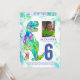 T-Rex dinosaur photo template 6th birthday party invitation. For the boy who is turning 6 and loves dinosaurs. This Roaring T-Rex invites Dino fans to a fun sixth birthday party. Personalise this colourful watercolor splash blue and green sixth birthday invitation with a photo of the birthday boy or girl, the number of the birthday and the party details and you are all set for a fun packed dinosaur themed dino birthday. All dinosaur species are welcome. Original artwork by artist Catherine Sweetman