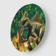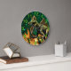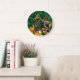 A funky, fun and eye-catching wall clock featuring a large tyrannosaurus rex prehistoric animal walking through burning flames and green foliage. There are lime green numbers to help your son tell the time