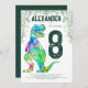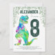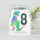 Set the theme to celebrate your dinosaur loving birthday boy or girl with this colourful scary Tyrannosaurus rex Jurassic jungle dinosaur 8th birthday party invitation. Easy to personalise dark green modern typography with all the party details. Unique psychedelic T-Rex dinosaur illustration and jungle foliage original artwork by artist Catherine Sweetman