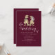 This unique wedding invitation showcases an original watercolor illustration by artist Catherine Sweetman of a T-Rex bride and groom ideal for couples who love dinosaurs, Jurassic themes, or non-traditional destination wedding celebrations. The rich burgundy background contrasts beautifully with ivory cream calligraphy and clean modern typography, creating a look that’s romantic, stylish, and fun.