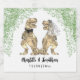Delight your guests with these fun dinosaur themed wedding custom wine labels. Fun dinosaur bride and groom in brown hues and green watercolor eucalyptus foliage. T-Rex dino bride and groom with Easy to personalise bride and grooms names and the wedding date in modern whimsical typography script. Unique original dino artwork by artist Catherine Sweetman