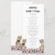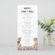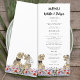 Delight your guests with this fun dinosaur themed wedding menu with funny T-Rex bride and groom in a colourful prehistoric wildflower meadow. Easy to customise with the bride and grooms names, the wedding date and all the wedding menu food details in modern typography script. Fun Tyrannosaurus Rex bride and groom dino annd watercolor floral illustrations in pink blue purple yellow orange and green hues. Unique original dino artwork by artist Catherine Sweetman
