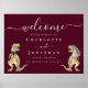 Dinosaur Theme Wedding Welcome Sign Poster Burgundy Red Wine & ivory cream with T-Rex Bride and Groom