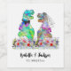 Dinosaur theme wedding wine label to delight your guests with funny Dinosaur bride and groom in a beautiful colourful wildflower meadow. Watercolor T-Rex bride and groom being roarsome in psychedelic funky bright colours modern take on prehistoric dinosaurs illustration and easy to customise with the bride and grooms names and the wedding date in fun whimsical typography script. Funny Tyrannosaurus Rex bride and groom and watercolor summer floral illustrations in purple blue pink green yellow and orange hues. Unique original dino and summer floral artwork by artist Catherine Sweetman