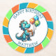Adorable Personalised Boy's Birthday Party paper coasters. Cute dinosaur theme in blue, orange and green. Cute cartoon dinosaurs holding balloons and birthday cake. Add name and age in the personalise area.