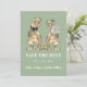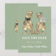 This save the date showcases original watercolor artwork by artist Catherine Sweetman, with hand-painted T-Rex bride and groom illustrations paired with clean, modern typography on a stylish sage green background for a stylish yet lighthearted look.