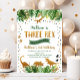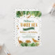 This adorable birthday invitation features tropical watercolor leaves with gold foil leaf embellishments and gold dinosaur silhouettes.