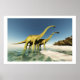 Two Diplodocus dinosaurs wade through shallow waters to reach an island with vegetation.