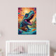 Whimsical and vibrant dinosaur that seems to be a blend of fantasy and prehistoric charm. The dinosaur has a long neck and a large head, featuring a wide-eyed expression with captivating, oversized eyes that give it a cute and curious look. Its skin is adorned with intricate patterns resembling colourful, swirling shapes and dots, almost as if its body is painted with a kaleidoscope of textures in blues, greens, yellows, and purples. The vibrant background, with its swirling skies and abstract planets, gives the impression of an otherworldly landscape, suggesting the dinosaur resides in a surreal, fantastical world. The bright, exaggerated colours and playful features give the creature a friendly, animated character, ideal for a magical or dreamlike setting.