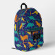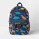 Model of backpack with colorful dinosaurs and a label to customize.