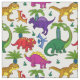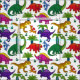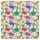 Colourful kid's dinosaur fabric featuring tyrannosaurus rex, pterodactyl, stegosaurus, spinosaurus, brontosaurus and tricerotops. A colourful design in blue, orange, yellow, purple, pink and green