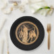 Set of eight 9” paper plates with a black and gold image of Dionysus, Greek god of wine and wine making and ritual madness, and the satyrs.