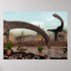 Diplodocus dinosaurs herd near a lake and williamsonia trees and cycadeoidea plants in the desert - 3D render