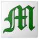 The letter M in Diploma typeface in a medium green on a white background with a slight shadow to give it a three dimensional effect.