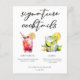 This chic signature cocktails menu sheet features custom black typography above 2 drinks and their ingredients for your wedding bar. A cute Dirty Shirley Temple and Mojito drawing add a cool flair to your bar menu. Complete with the couple's names and date for their reception.