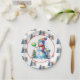 Disc golf themed Christmas party paper plates.. Disc golf themed art. Cute watercolor cartoon snowman in Santa hat next to a disc golf basket in the snow next to a Christmas tree.