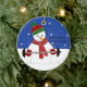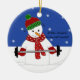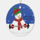 This stylish snowman understands that discipline is key to staying in shape. He's pumping iron to maintain his figure, donned in a red hat and scarf, hoisting a hefty barbell. Snowflakes drift down against the backdrop of a clear blue sky, creating a delightful winter-themed ornament ready to hang on a Christmas tree.