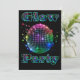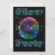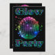 This invitation has a large colourful disco ball and the words Glow Party on the front and a small disco ball on the back with sample party invitation text. Use the customise button to change or delete any text on the back.