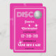 A fun groovy elegant look that transports us back to the 1970s. Disco in in outline font with a sparkly disco ball image and more sparkles on the card. Multiple lines framing the front complement the type. Your names in a 70s flare font.