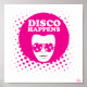 Poster featuring graphic design of man with pink afro and sunglasses. Within his afro are the words "DISCO HAPPENS" Product of Arny L. Designs.